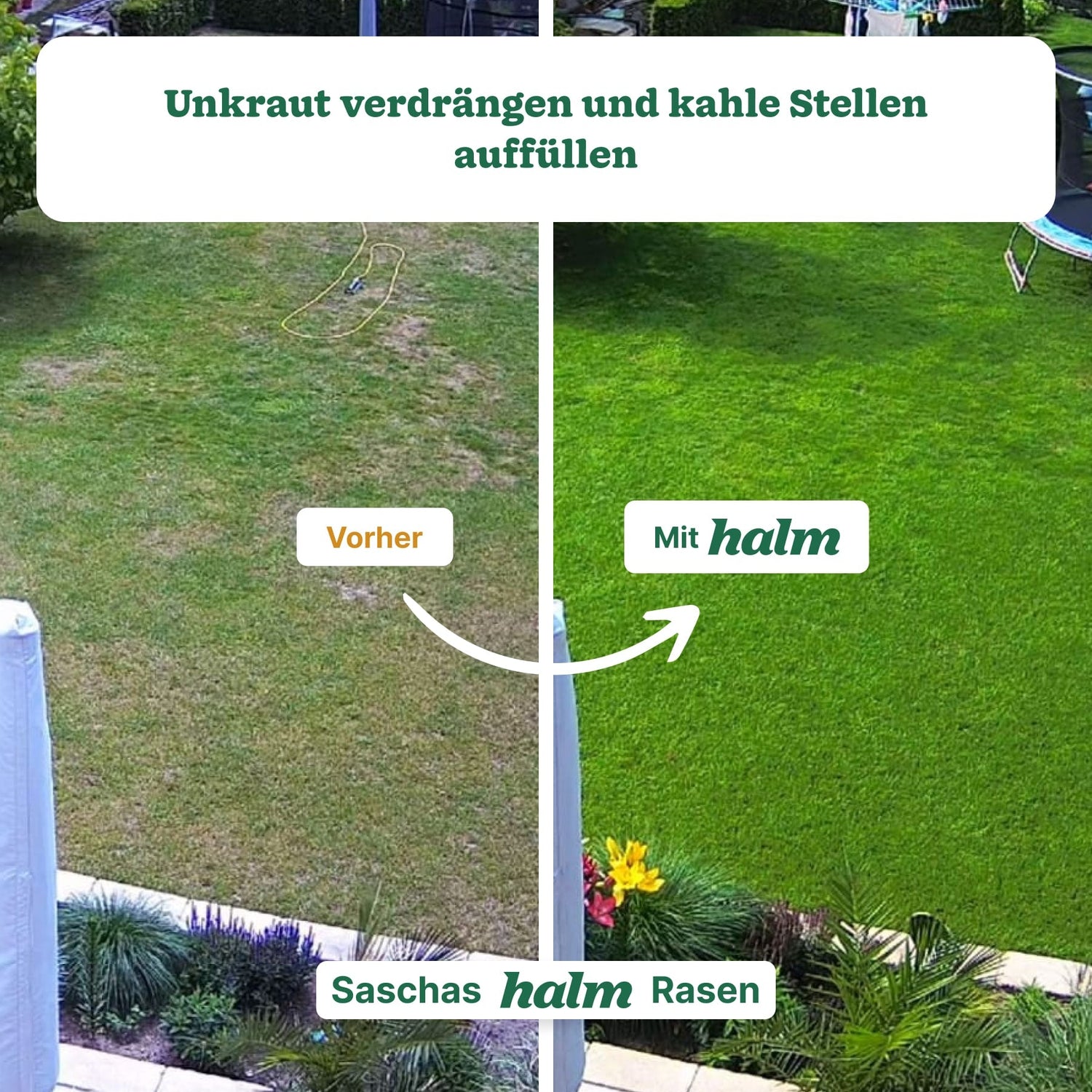 Für welche Rasenflächen ist die Halm Füllsaat (Nachsaat) geeignet? Verwende die Nachsaat auf jedem bestehenden Rasen, der unter einer geringen Dichte oder kleineren kahlen Stellen leidet. Sie ist geeignet für Trockenrasen, Schattenrasen oder strapazierten Gebrauchsrasen. Wenn du neue Flächen oder größere kahle Stellen ansäen willst, verwende unsere Kraftsaat (Neusaat).